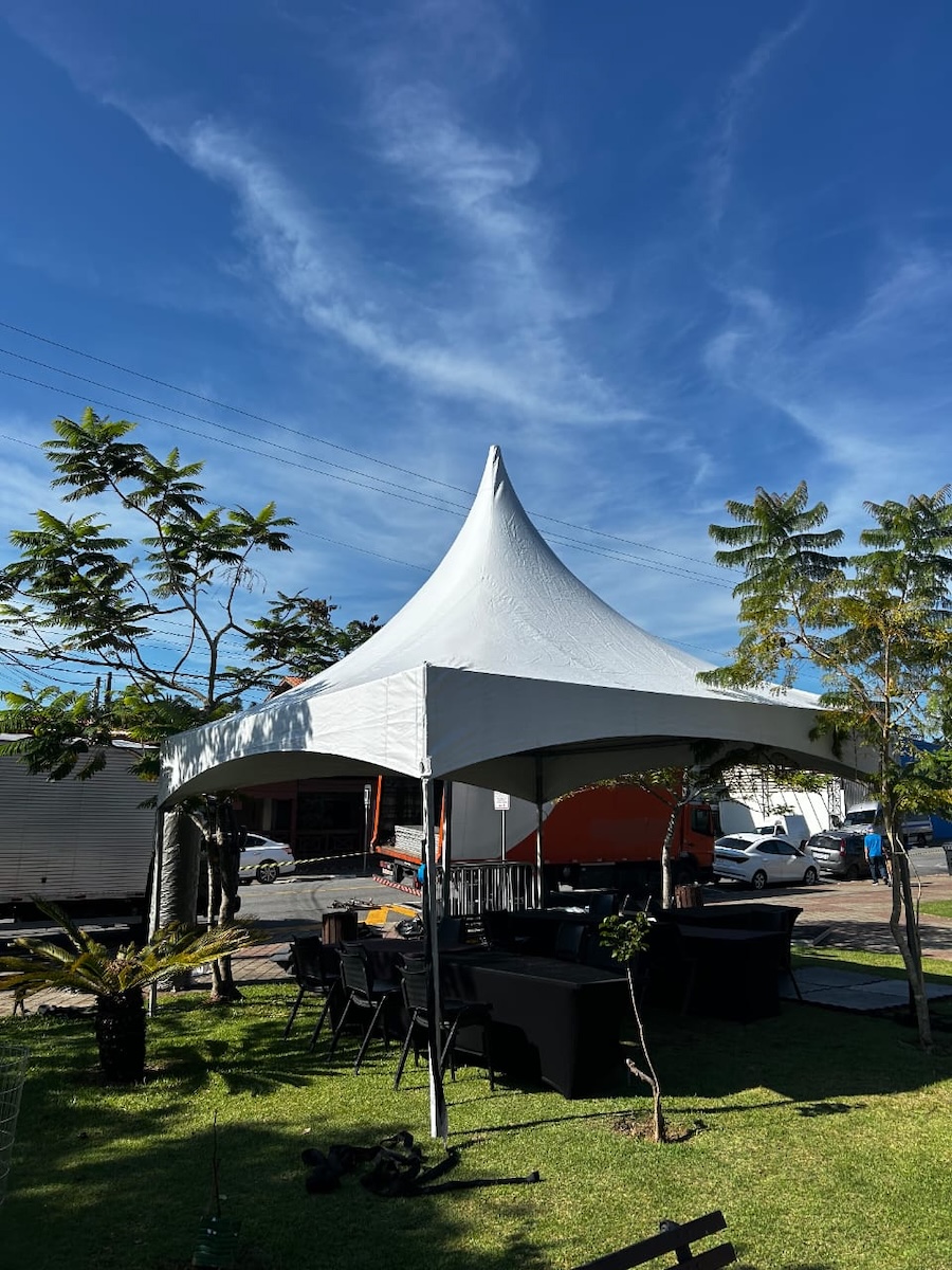 A lona de cobertura em PVC tensionado garante resistência à chuva, vento e radiação solar, mantendo o ambiente interno protegido e agradável.